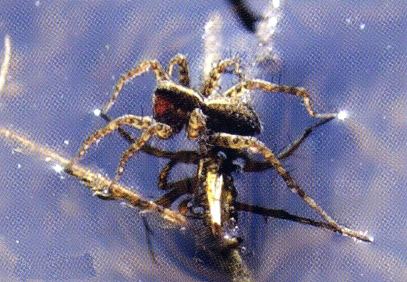 No libro tamén se estudian os medios lénticos e por suposto os que viven nas beiras da auga pero poseen mecanismos especiais para cazar na auga. É o caso dos Lycosidae que se ve na fotografía.