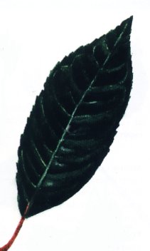 As follas son ovais, lanceoladas, dunhos 12 cm de largo, dentadas, coa face verde oscuro brilante.