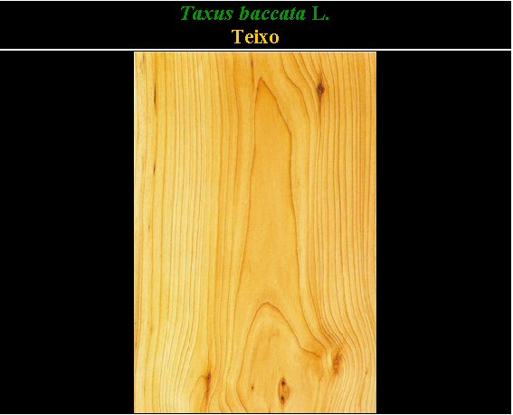Nota: taxus, que é o nome latino do teixo, derivada de ordenado en filas, como así é a ordenación das súas follas en dúas filas ou en grego taxikos: veleno, que podría ser xa que o teixo é veleno puro. Todo é veleno agás a envoltura da semente ou arilo. Baccata é baga, ven do latín baccatum, pola apariencia do seu froito.