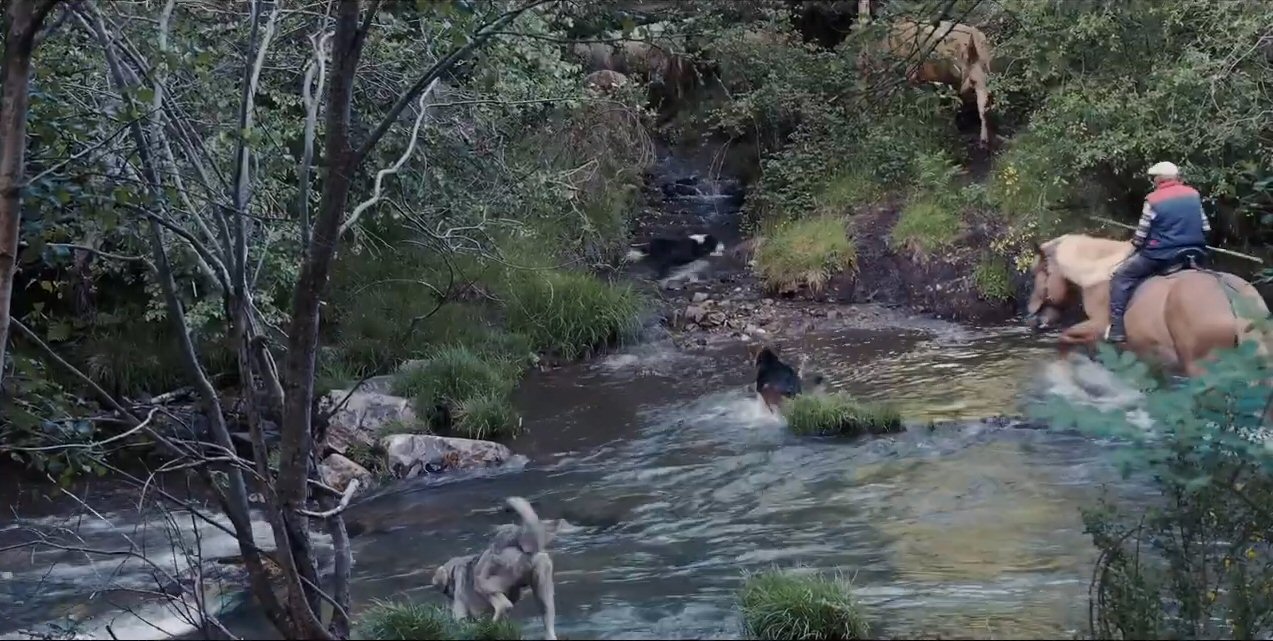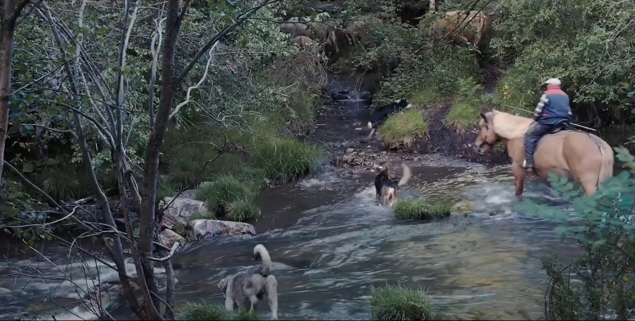 Na fotografía, que é anterior (esta sacada do video de Xosé Fuentes) vese o paso da egua, os mastíns e o Border Collie, que por certo este último non se mollou, mentras os outros tres pasaron a nado.