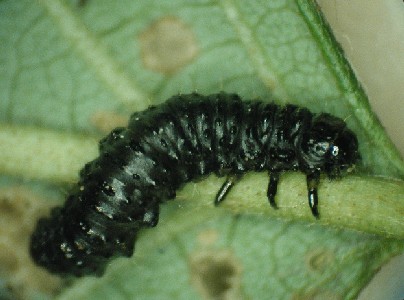 No estado de adulto é negro, seis patas, as posteriores bastante
