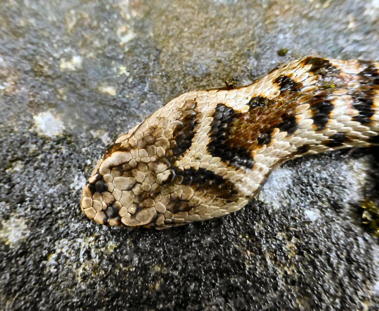 Detalle da cabeza. Observar, a cabeza triangular, a doble V invertida, a cantidade de escamas e o típico dibuxo do lombo. As pupilas verticais non se observan ben, salvo no ollo dereito.