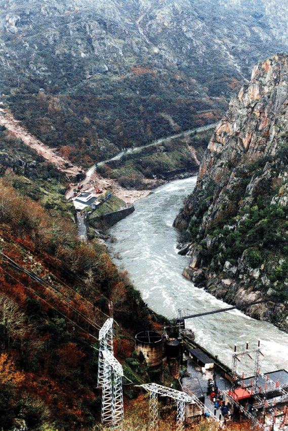 Ourense. Xaneiro do 2001. Encoro de San Esteban. Estaba soltando auga que daba miedo. Fotografía xusto debaixo da central. Estaba cortada a estrada os Peares xa que se derrumbou polo regato que se ve na fotografía a esquerda...