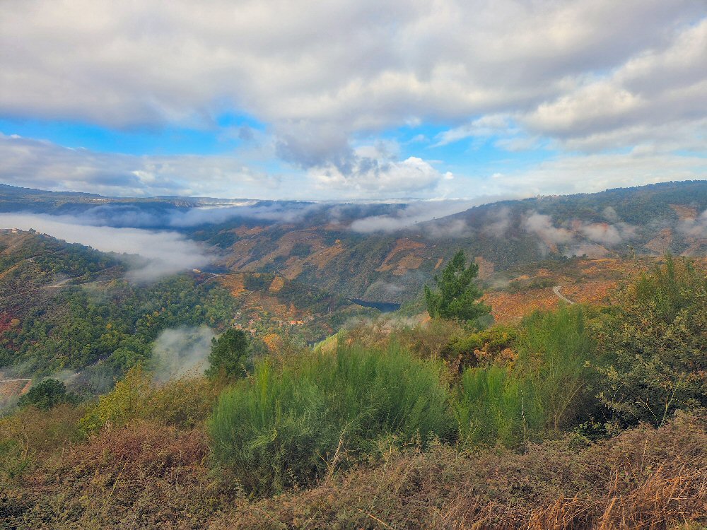 O canón, xa está dito, son 6 km. de recorrido moi dificil de andar; en algúns lugares imposible camiñando. Na fotografía a niebla da dereita arriba é o canón do Sil e a niebla baixa de esquerda a dereita ao canón do río Mao; ese día da fotografía, a mañán había néboa, chovera toda a semán, logo fixo un día marabilloso.