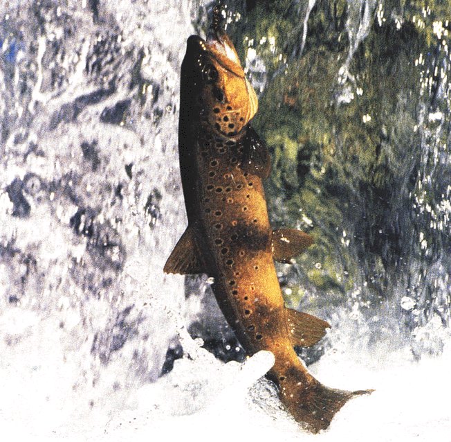 Imagen de troita común, sensacional. Fotografía da revista Biológica. Troita clavada xa no anzó.