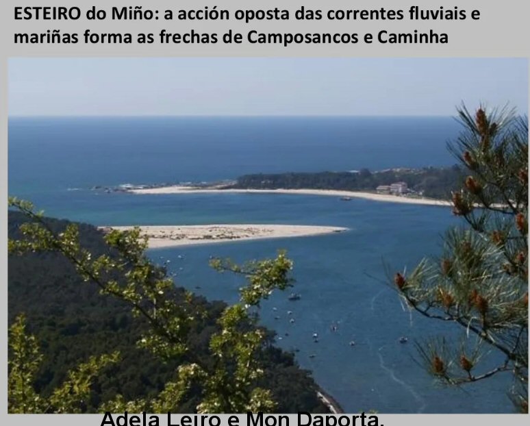 Ver o exemplo claro na seguinte fotografía de Adela Leiro e Mon Laporta. Frechas que o río Miño produce na desembocadura, neste caso na zona de Caminha, a esquerda da fotografía e na zona de enfrente en Camposancos